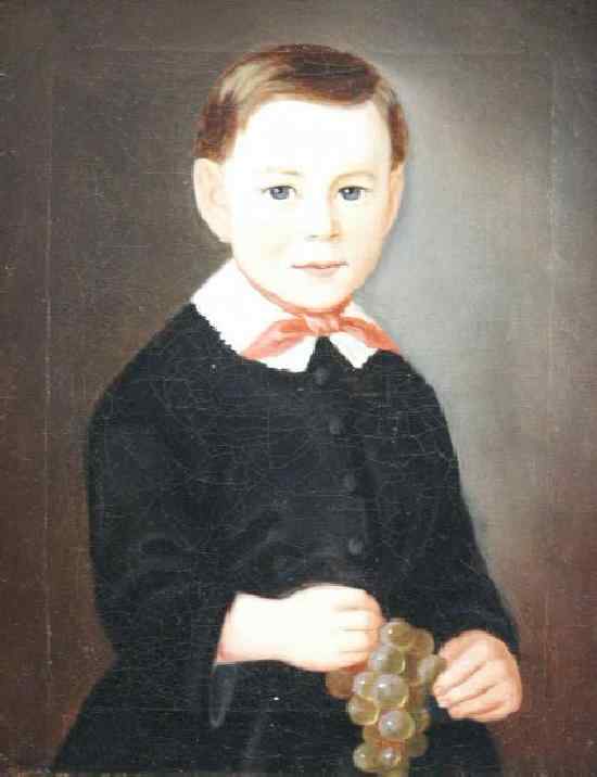 This portrait was painted in the mid-19th century (figure 1). The artist is unknown, but the E-bay seller attributes it to a German Biedermeyer artist. He describes the portrait as, "The painting represents a brilliant portrait of a little boy dressed in a black blouse with a white collar and a read scarf around his neck. A brilliant empire portrait with a splendid color variety, many details, a fine characterization of the head and face, and an eminent light." I'm not sure why he describes the portrait as both Biedermeier and Empire, but it does look to be a mid-century painting. I'm not positive, however, that it is a German portrait. It was done, by a competent, but not brillant artists. The boy's plain suit and grey background suggests that he did inexpensive porteaits turned out as quickly as possible. It is not clear just what this boy isearing, but it looks to be a dress.