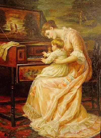 We are not positive, but this painting looks American or English to us. We would date it to the late 19th century, perhaps the 1880s. It pictures a tender momenmt between a mother and child. The lady wears a luxurious orange dress and is olaying with her baby in front of a musical instrument, perhaps a harpicord. Notice the beautiful painting on the harpsicord. The baby wears a long white baby dress.