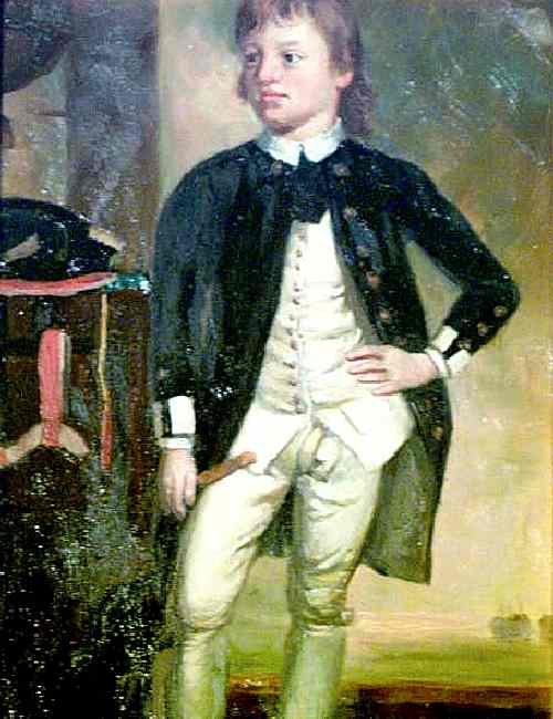 This painting may be difficult to attribute as it may not be by a major artist. We believe it is English. It looks to be a boy about 12 years old. I am guessing that he may be a midshipman about to go to sea and begin a career in the Royal Navy. He looks to be wearing a naval uniform. I am not sure, however, how to date the portrait. I would guess the late 18th centuty, perhaps aboyt the time of the American Revolution or before the Napoleonic Wars of the 19th century. I am not sure what is on the table beside him, perhaps his naval cap. Also I am not sure what he is holding in his hand. The image is difficult to date because the officers of the Royal Navy, unlike the enlisted men, wire knee breaches well into the 10th century. Also notice the heavily buttoned white vest matching the knee breaches.