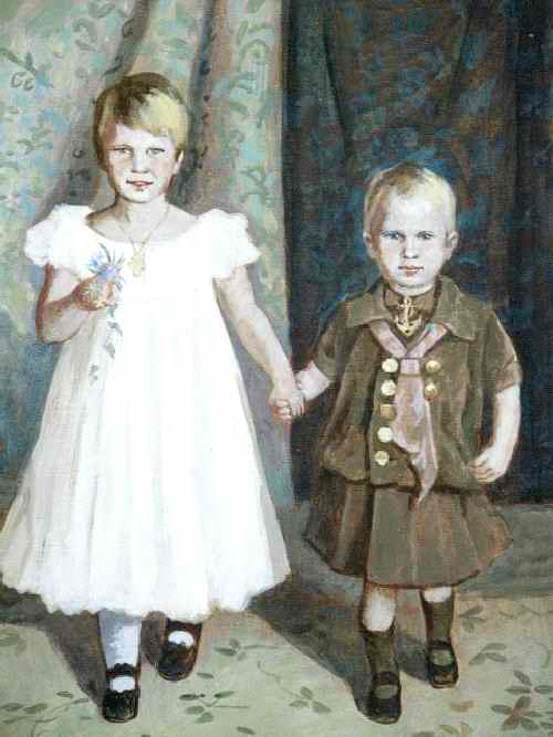 Here we believe that we know when and wear this charming portrait was painted. The little boy's sailot tunic suggest that the paortait is American, painted about 1900. This may be another painting that is difficult to attribute because it was probably not done by a major artist. It does illustrate popular conventions at the turn of the century. We are not sure, for example, to what extent girls wore tunic suits like their brothers. In this family at least, a tunic suit waa a boy's outfit. This little boy older sister wears a plain white frock. Many girls at the time had long hair and hair bows. Some girls, however, like this girl had short hair. Norice that the boy's tunic suit is brown.