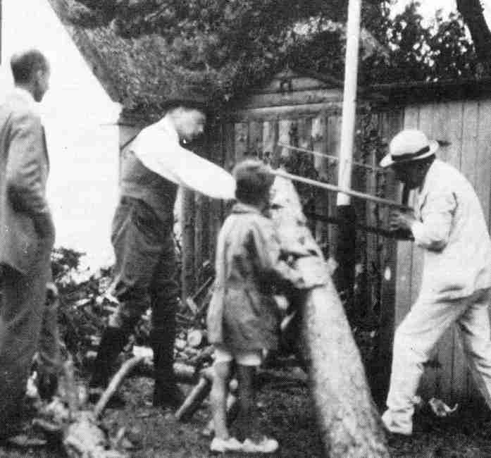 Figure 1.-- Here Bohrn is at Tisvilde sawing wood. I assume the boy is one of his sons. He looks to be wearing a smock. |