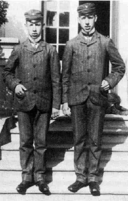 Figure 1.-- This is Neils and Harald as students at Noerumgaard (1904). They wear student caps, but their suits are idebntical becaise mother bought them, not becaise it is a uniform. The boys here woud be about 17-19 years old. |