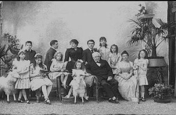 re-arranged. Whatwe do not know is the order in which they were taken which would have been interesting. In one the youngest has dozed off. In another Robert the boy in a dress on the right looks indignant and impish, and possibly to calm him down he and his elder brother Paul swap places, and he is sitting next to his father. I can imagine the coversation. "You sit HERE and behave yourself." Kids don't change. We see: Back Row: Bertrand 13: Matthieu 18: Mme De L: Ishmael 17: Consuelo 13 Front Row: Solange 11: Eugenie 12: Gizelle 5