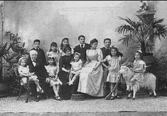 We have developed some specific details on the children to help identify them. This may be of assistance to readers as ot is a little complicated identifying the children in these group portraits. The de Lesseps had an impressive family of 11 children who survived into adulthood. One child died in infancy. The two oldest childrn were boys. The oldest child Mathieu was born in 1870. Ismaël born in 1871 was the next child. There were six boys in all. The oldest girl was Ferdinande born in 1872. Ther youngest Child was Gisèle born in 1885, Ferdinand's 80th year. Nine of the 11 children are in figure 1 on the previous page and we believe that 5 of the children in the photograph here are boys (figure 1). Our guess is that in addition to Paul and Robert, the child on the far right, the child on his father's lap, and the child held by the mother are boys.