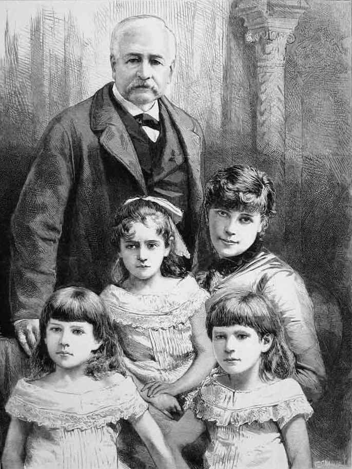 The portrait here is of the de Lesseps family. The Vicomte de Lesseps was one of the most famous Frenchman of the mid-19th Century because of his role in building the Suez Canal. De Lesseps remarried in 1869. He married Louise-Helene Autard de Bragard of ??????, just after the inauguration of the Suez Canal in 1869. Mlle was much younger than the Vicomte. He was then 64 and she was only 20. They are pictured here with their three oldest chiloden: Mathieu (Pierre) (1870-1953), (Ferdinand Marie) Ismaël (1871-1915), and Ferdinande (Hélène Marie) (1872-1948).