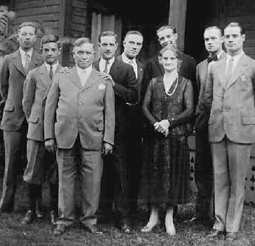 ![]() Figure 5.--Notice that the younest Hope brother still wears a knickers suit with long stockings. Bob is second from the right. The photograph was probably taken about 1922. |