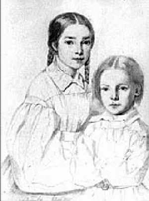 Figure 1.--Here we a portrait drawn by their mother showing Léopoldine and François-Victor wearing similar looking smocks. It was probably done about 1832 when Léopoldine was about 11 and François-Victor about 4 years old. There hair is done similarly except Léopoldine has pigtails. |