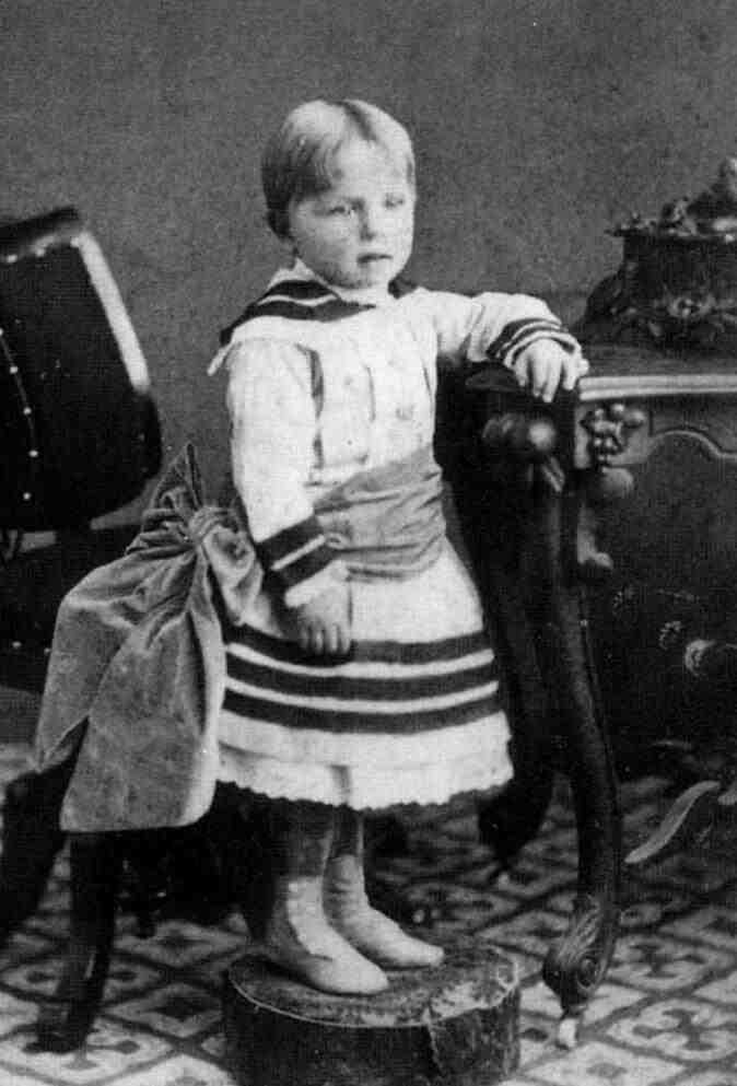 We do not have much information about William's clothes. We have one photograph of William as a very young boy. We see William at 2 years if age in 1876 (figure). His hair has been cut short, but he has not yet been breeched, Note the huge sash. I don't think I have ever seen one so large. He seems to be wearing a petticoat with the dress and unusual patterened stockings. His shoes seem to have been colored, perhaps matching his dress.