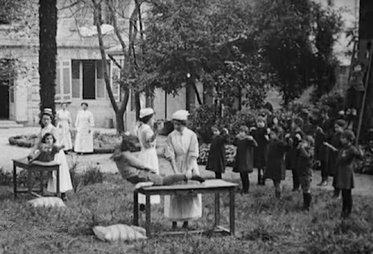 We do not yet have have details on the clinics that the Committee opened. Medical issues were dealt with by the American Women's Hospitals. The Committeed developed a close relationship with them. The Committee did open clinics. Morgan brought in French nurses to get the clinic porogram started. They helped train the Pikardy women. The clinics started keeping records on the younger children to monitoir their weights and growth trends and identify children that needed special care. We see the nurses leading exercises and testing out the children's physical development. The nures also gave lessons on hygene and nutrition to mothers.