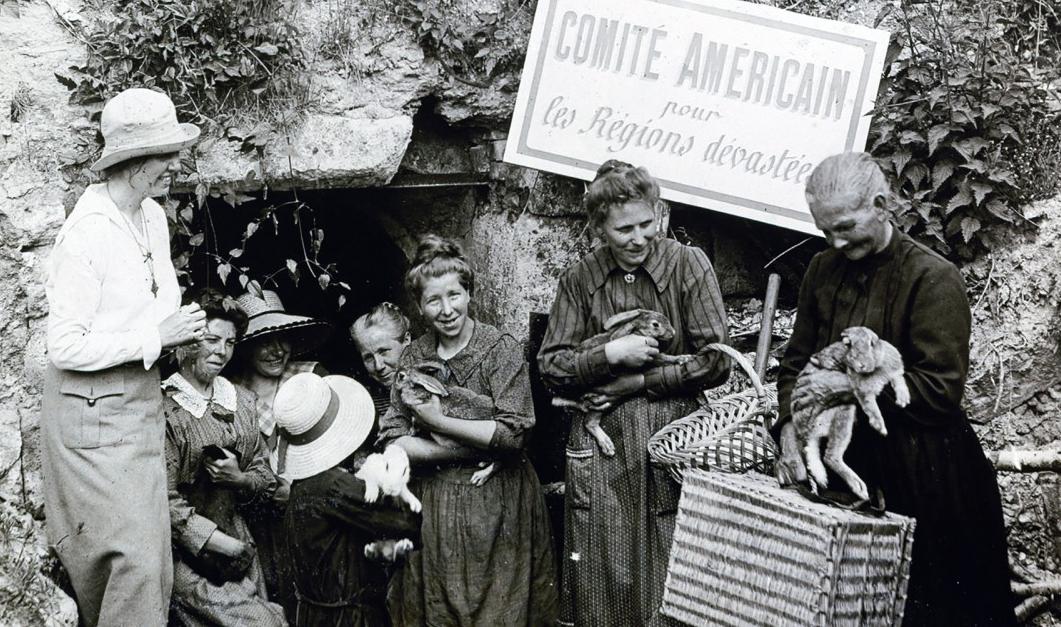One of the most important was obtaining livestock for the peasants trying to start up thrir farms. Few had the money needed to buy livestock. The Committee brought some livestock from America. Most came from other parts of Franced. This was a very costly undertaking as the price of livestock increased during the War. They American Committee began repalcing livestock, understanding that this was vitl to getting the farms ans economy functioning. We see a new calf arriving on the previous page. Here we see rabbits arriving (figure 1). That was a big ticket item. There were many smaller farm animals including chickens, geese, rabbits, pids, and goats. We think at first these amimals were given away, but gradully the peasant farmers were able to come up with some of the monery. Some of the smaller animals like chickens and rabbits provided a very short-term payoff, both producuing food and something to sell. The rabbits look like pets in the pohotogrphs, but they sere in fact a badly neededd food item nd something which could be sold un the market. Wih calves there was a much longer time horizon. Draft animals like horses anf ixen were skso important. We sre not sure to what extent the Americn Committee gotbinvolved with them, but they did get involved with tractors. We do not know just what the financial arrangements were.