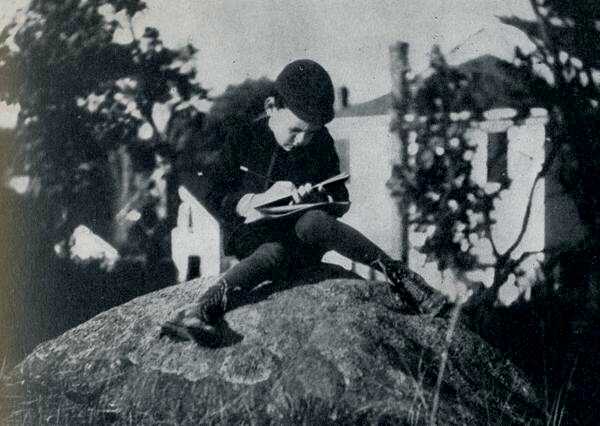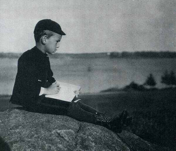 is sitting on a large rock near the sea and apparently writing in a notebook which he kept as a child--an early adumbration, perhaps, of his calling as an author and playwright. He seems to be wearing schooboy
