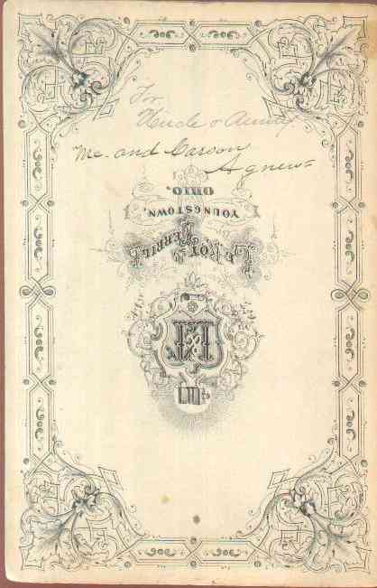 ..... Mary McNaughton Agnew (1848-1934). In other words, these are supposed to be pictures of the future mother and father of Mc and Carson when they themselves were children. The boy sits on his father's knee and the girl sits on her mother's. They face each other. These two families lived in two Pennsylvania towns about 10 miles apart (Mercersburg and McConnellsburg). Both families were staunch Presbyterians and storekeepers. So, they might have known each other from an early age. But, could some itinerant photographer really have just shown up and taken these pictures, with complementary poses? Then there is the fact that the images are on paper. Albumen paper prints were not made in the 1850s. So we are guessing that these are copies of Dags or Ambros taken in the 50s and enlsrged so tht thy could be hung on the wall. Presumably a grown up Mc or Carson had this done so he could hang up portraits in the wall. Such detailed inscriptions are usually accurate and the hair styles seem appropriayte for thr 1850s.
