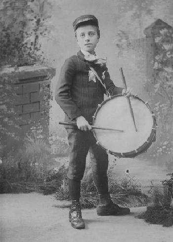 Figure 1.--This cabinet card of Oscar George Henry Auffurger was probably taken in the 1880s, although it is not dated. Oscar is pictured with a drum. He clearly is not a Civil War drummer boy, despite the kepi cap. The fact that he is wearing kneepants clearly shows that the portrait was taken later. Hanging on his jacket is what looks like a flag decoration, suggesting a political campaign. The writing on his cap reads "COLUMBUS". I'm not sure what that means. Perhaps it was the name of a band. The photo was taken in Erie, Pennsylvania. |