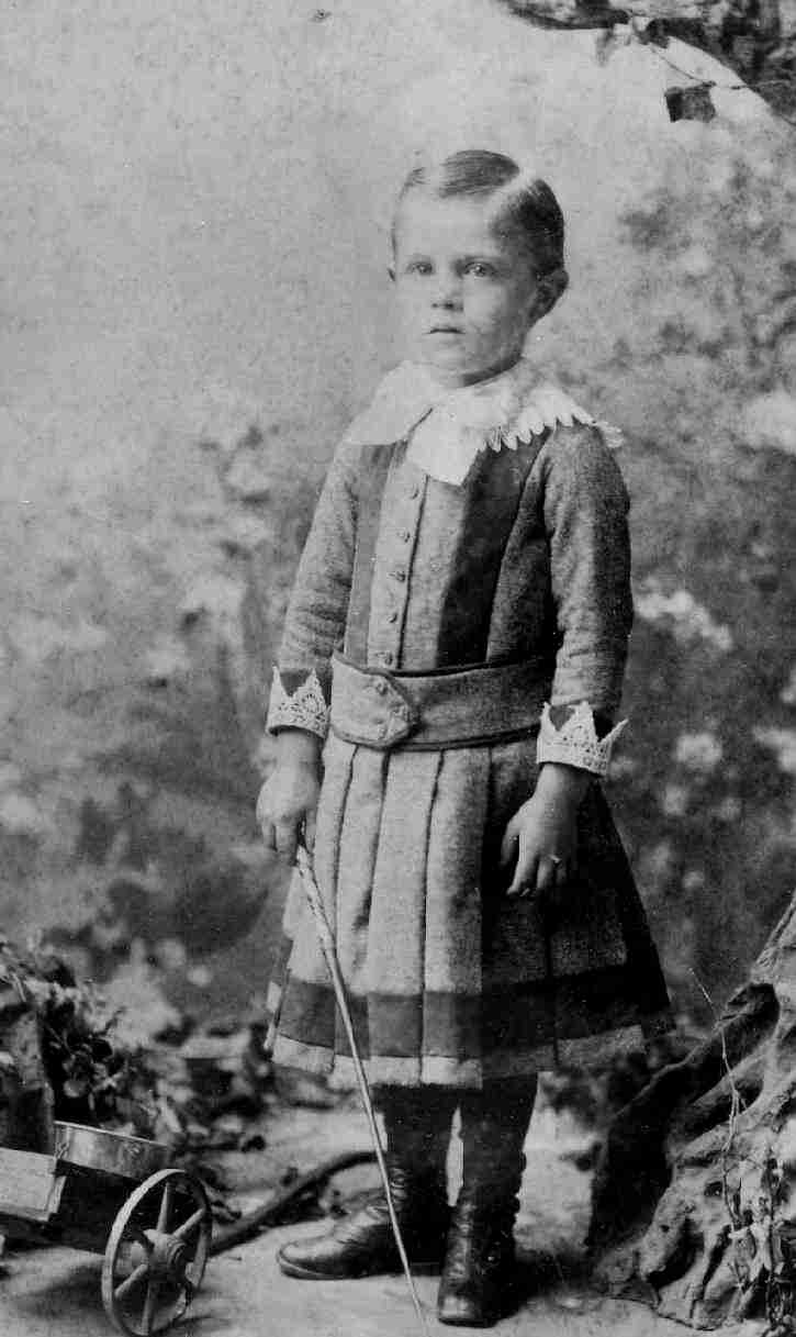 He is dressed in a fancy pleated dress with lace cuffs and collar. He was photographed with a stick. I think it is too slender to be a walking stick, so it may be some kind of riding crop? Alongside him is a little toy cart with a tin pail in it. We do not know if these are studio props or items Arthur brought with him.