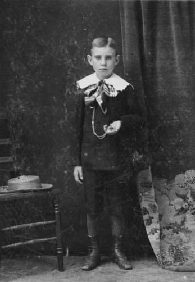 This boy is Charles Banthrop. He is identified on the front as "Chas Banthrop". He was 6 years old. The photographer and thus the location is is not indicated. The boy could be British, bur we think he is provably American, the floppy bow and long stockings in particular point to this. Tgere is a flat-top sailor hat on the chsair to the left. The boy's jacket is not clearly shown. It might even be a tunic, but tunics we not all that common at the time. He wears an emaculate, large starched collar with scalloped edges. The coolar may have been detachable or a pin on collar rather than part of a blouse, but this is difficult to determine. He also has a moderate-sized plaid floppy bow. Charles wears knee pants and long stockungs. The long stockings are dark, but may not be black. Note the watch fob and pocket watch the boy is holding. This was rather unusual for a younger boy.