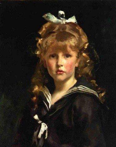 This is one of John Singer Sargent's earlier portraits during his time in France (1880s). This charming portrait of Jacques Barenton. The Southerby Auction House in New York handled the auction with a Guide price of $1-1.5 million dollars. Like many such portraits of young boys at the time such as Renoir works, boys like Jacques are often described as young girls. Among the clients coming to Seargent's Paris studio were the Brentons, Jacques; parents. The resulting portrait of Jacques (1883) was the first in a series of Parisian paintings (1880s). Several depicted young boys in sailor suits which along with the Fauntleroy suit in the second half of the century had become the peak of fashion for boys at the time. Jacques wears a traditiionally styled sailor suit which lppks black rather than navy blue. Notice the fancy long hair. His hair was not done in tight ringlets as was common in America, but had a prominant light-blue hair bow. We have tried to find some information about Jacques, but have found virtully nothing. He may be related to M. O Barenton, a wealthy confiseur (Confectioner) of the time.