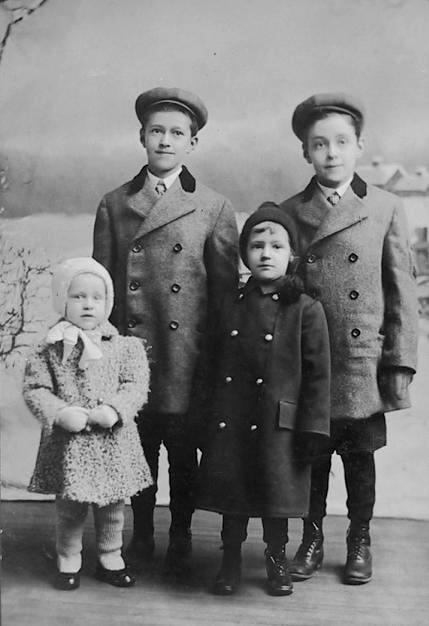 This postcard back studio portrait shows the four Bennett children. On the back of the card the encription tells us, "Four sons of E. Augustus Bennett and Sadie Decker Bennett. BACK ROW Donald Bennett and Ralph Bennett. FRONT ROW Edward Bennett and Lowell Bennett”. The children look to be about 3-10 years of age. All the boys are dressed in winter coats and hats. The boys' wear overcoats with double-breasted styling. Note the velvet on the collars. Notice how the caps match the overcoats. We are not sure about the suits. These overcoats suggest the children were part of an affluent family. The two older boys wear flat caps. The younger boy wears a stocking cap with a pom. The little sister, Sadie, wears ‘baby’ style clothes. Notice the knitted leggings. Also note the heavy black long stovkings for winter wear. There is no indication of where or when this portrait was taken. The AZO stamp box has four upward pointing tringles which date it to 1904-18. The boys knickers look more like the 1910s than the 1900s.