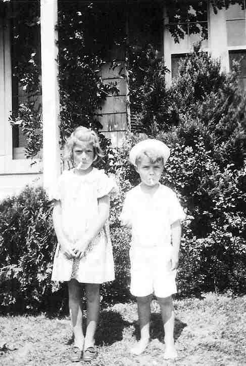 Here we see Margaret and William in front of their home or perhaps a summer cottage (figure 1). It looks a little plain for a family that could afford a big car and chauffeur during the Depression. The children are dressed for play. Margaret wears a dress. Girls in the 1930s still wore dresses, even for play. William wear a non-descript white outfit. He wears a navy swabie cap, popular for biys at the time. He is barefoot which also suggests to us that this may have been the family's summer cottage. The children have cigarettes to add a playful touch. Perhaps dad smoked or perhaps they were candy cigarettes.