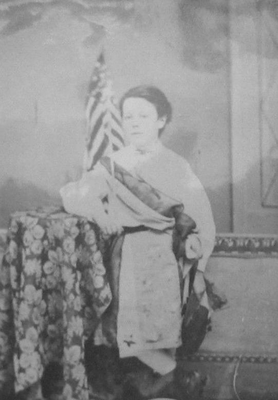 We like to use nice clear photographs in our site, but sometimes we find interesing images that we use even though the image is of poor country. The boy in this studio CDV is Johhny Blood. It is not dated, but the CDB format, clothing and flag all uggest it was taken during or right after the Civil War. We cannot make out the studio and city, but is clearly some where in the North. It is difficult to make out what he is wearing, but it looks like a light-colored knee pants suit and white long stockings. He seems to have a military sash with a star, unusually worn in the front rather than a the side. We think he is holding a canteen, but are not sure. Note the flag with the star fomation in the blue field.