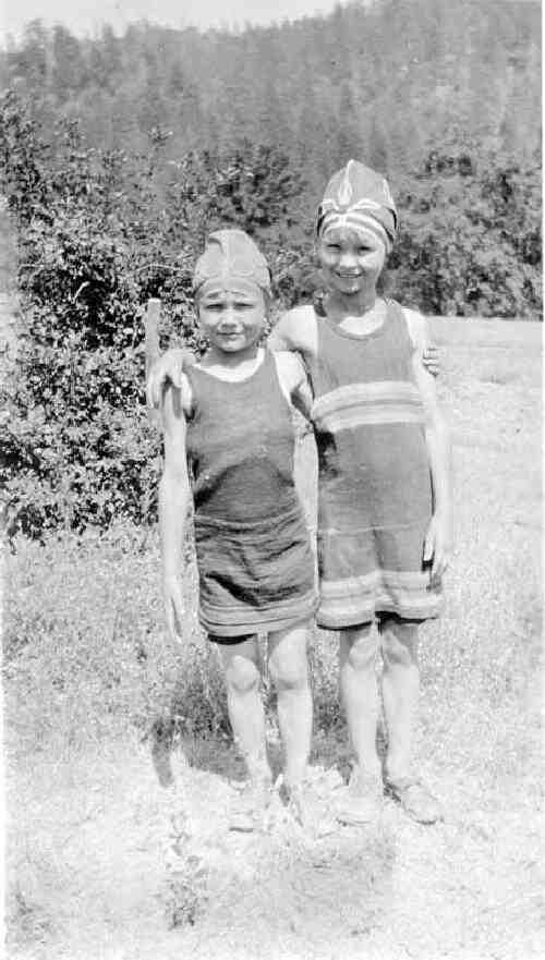 Here we have brother and sister Pete and Pearl Carter. Pete is the child on the left. The children look to be about 6-9 years old. The snapshot is undated, but we would guess based on the bathing suits. was taken in the 1910s, perhaps the early-20s. They look to be in the mountains, probably enjoying a freshwater lake on their vacation. We are not sure where the snapshot was taken, but the children are presumably American. The trees in the background look like conifers, meaning a northern state, perhaps somewhere in the west. The children wear the same style bathing costumes, .fairly standard bathing suits for the early-20h century. What we are unsure about is the caps that they are wearing. Girls wore bathing caps, but not boys.