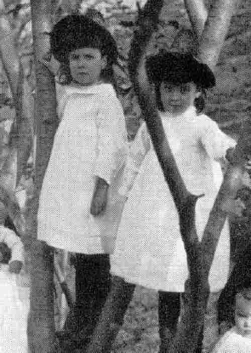 Figuring out who is who is a challenge. The two older children without smocks appear to be girls, perhaps 11-12 years old. There is no way of knowing about the three infant children. That leaves five children in between that look to be about 5-9 years of age. At least three of tem appear to be boys--although their outfits are virtually identical. The child to the left of mother is an enigma. The child could be either a boy or girl. The hat is quite disinct--suggesting that the child is perhaps a girl. Certainly the child to her right in the tree is a boy. The child further to the right may be a girl, although note the similarity in dress. We believe the child on the ground is a boy. The child on the extrene right would appear to be a girl--note the scalloped smock.