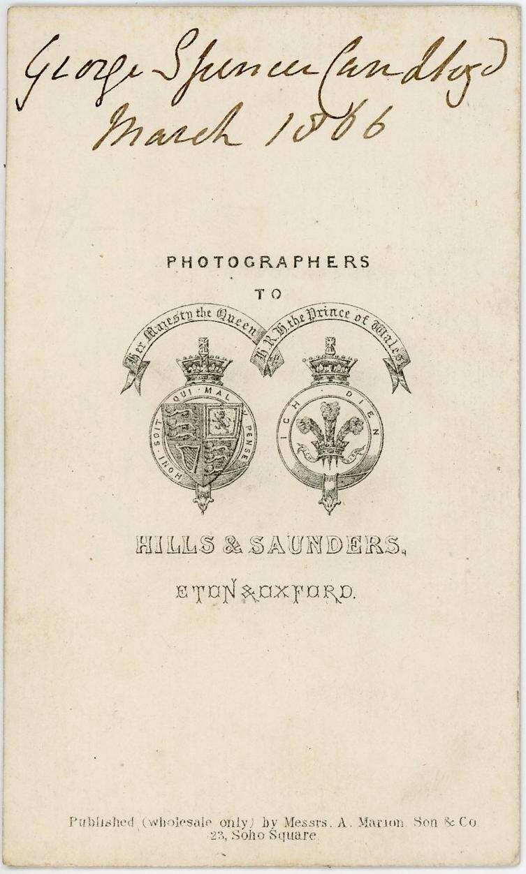 This CDV portrait shows George Spencer Carr-Lloyd in March 1866. Spencer is of course a very fan=mous name in Enhglnd, mist recently it was Princess Diuana's maiden name. George looks to be about 14, perhaos 15 years old. The studio was Hills & Saunders, Eton & Oxford. Hills & Saunders was one of the leading English Victorian photographic firms, started as a partnership between Robert Hills & John Henry Saunders. They were social photographers with studios at different times in: London (society), Harrow & Eton & Rugby (locations of leading schools), Oxford & Cambridge (leading universities), Aldershot & Sandhurst (army). The way George is dressed and with a studio in Eton, George surely must be a student at Eton College. This was the uniform worn by junior boys. Notice the top hat on the table. He wears an Eton College uniform consiting of a small Eton collr, short black jacket, vest, and light-colored trousers. The rather small and not very stiff looking Eton collar is interesting. The classic Eton collar that was to become so popular had apparently not yet fully developed or was not aslways wiorn away from school. George is also holding an umbrella. His uniform is very similr to the modern Eton College uniform. Notice the largely blank background, characteristic of 1860s CDVs. Not filling up the frame with the subject was another chracteristic of 1860s images. This was because the cards were often saved in albums that covered up the edges. We also see these same trends in the United States. In this case we have the date which helps us estimare when undated portraits were taken.