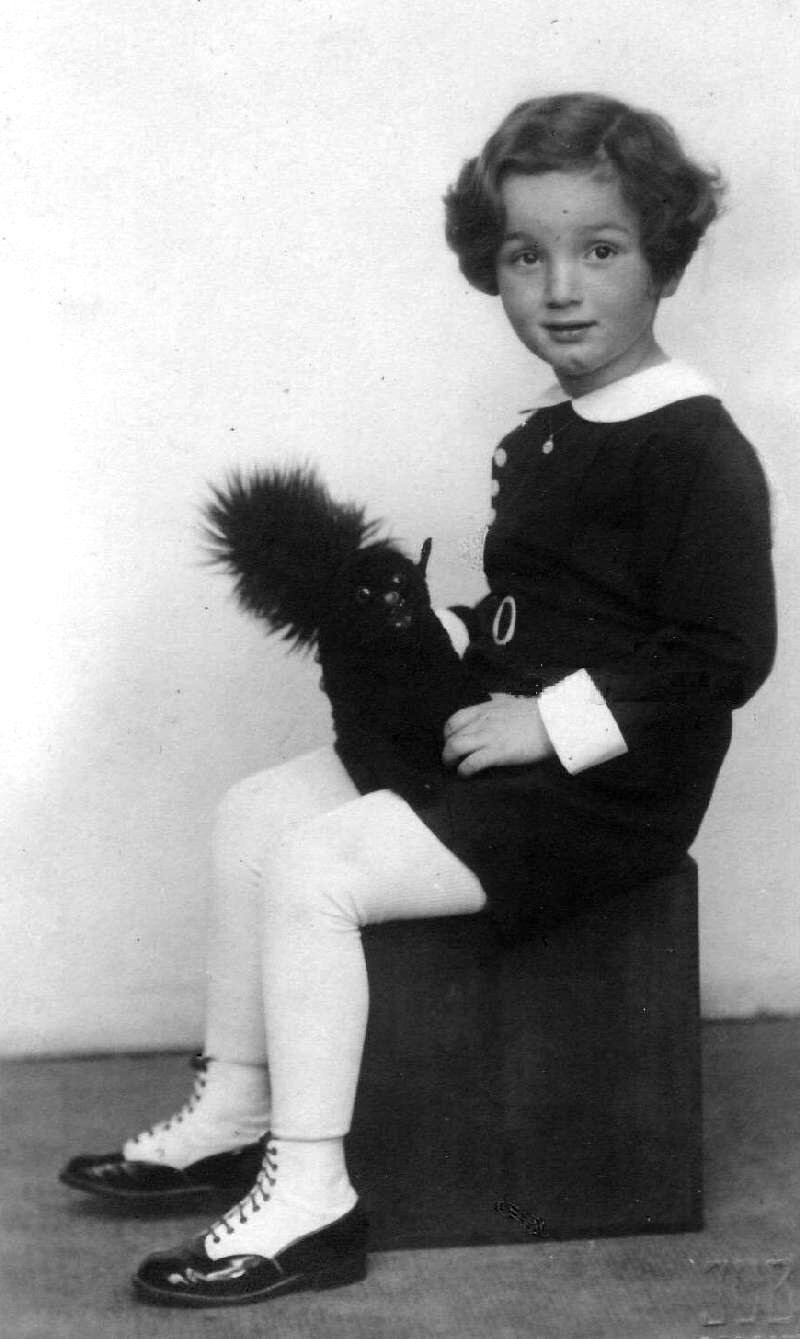 This is a birthday (Geburtstage) portrait of Paul Clemens. He turned 4 years old on March 7, 1935. He has longish over the ears hair. It is a little difficult to see just what he is wearing. It looks to us like a button on shorts set with a self belt. The belt probably coverd oner the waist buttons. The outfit has a large white Peter Pan collar and white sleeve cuffs. The blouse top buttons at the side like a tunic and Paul wears a lockett. He has white long stockings which look to be worn with long underwear. The weather can still be cold in Germany during March. The outfit is complete with spiffy two-tone high-top shoes. This was not a very common style at at the time, but we do occasinally see them. We suspect that this is an outfit that ould have been worn by a boy from an afluent family. He holds what looks like a stuffed cat, perhaps his birthday present.