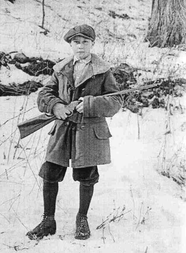 Paul was the younger brother. He was born several years after the other boys, I think about 1909. Thus he would have been the baby of the family. Paul either died before 1933 or is still living. One of the images in the collection dated 1911 lists him as being 22 months old. This is pretty consistent with the images. Harold and Richard or Harold and Raymond are pictured together but Paul is alone in all of the images, except for one of him with his sisters. This provides some cluses as to ages and family relationshios. We note a portrait of Paul about 1921. He is hunting in thw wood and photographed with a rifle. We don't know when Paul was born, but in this photo Paul seems to be about 14 or 15. He wears knickers, long black stockings, a shirt buttoned at the neck with no tie, a flat cap with a bill, and an outdoor jacket with a wide wool collar.