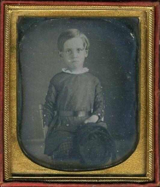 The American boy here is unidentified and undated. We believe it was taken in the 1840s because of the clothing, but would not rule out the early 50s. The cap was similar to that worn by soldiers in the 1840s. The Mexican War was fought during the 1840s and the boy's hat here reflects military styling during the Mexcican War. The dag housed in a leather case is a 1/6th plate size. The boy holds whay looks to be a peaked military-style cap with a large tassle. These caps are also called Oliver Twist caps. The pouty little blond boy is sitting on a tole chair. He wears a belted, lace collared tunic. We see these small ruffled and other collars worn with both tunics and suits. What we so not know id hust what kind of shirt/b;ouse they were attached to, Note the belt on the tunic has no practical purpose. Decorative buttons run up his shirt sleeves and dress pockets. Under his tunic he wears long trousers with a bold pattern, what looks to be checks. Notice the hair style, parted on one side and then just combed straight over. I have no idea what the name of this style was. We will call it a "straight across" comb until we learn of a better name. We have seen it, however, on other boys in the 1840s.