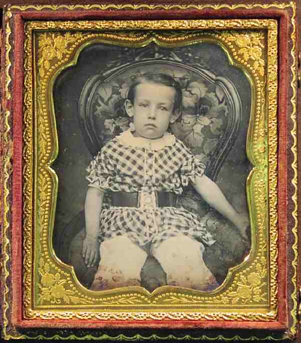 This is a 1/6 size daguerreotype portrait. This dag is protected by a brown leather case with velvet lining and gold trimed frame with embossed flowers. Dating Daguerreotypes is very difficult. And unfortunately modt dags are not dated. Unlike CDVs and cabinent cards, there was no convinient back surface where the owner could scrible a note. We are guessing that this portrait was taken in the late 1840s,but it could have been taken in the 1850s. We are not yet able to make informed assesstments as to the dates of the dags. The boy here was photographed in an fancy arm chair. People were almost always photogaphed sitting down. The slow speed of the dag pltes meant that subjects had to be steadied. looks to be about 5-6 years old. He wears a front-buttoning checkered tunic. This was a popular pattern for tunics, perhaps it was similar to plaid. The outmid had a mid-sized ruffle collar and ruffled short sleeves. He wears it with a very wide leather belt. Notice the large belt buckle. There are faint traces of gold hand coloring on his collar pin and belt buckle. He also wears white long pants or drawers. It is difficut to tell which from the image. He ha relatively short hair.