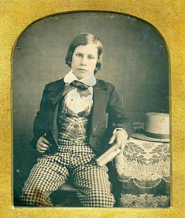 This daguerreotype portrait shows a sharply-dressed youth, who looks to be about 13-14 years old. He is seated, holding a book, with his rather tall straw hat on a table. The book may indicate that he was still in school. This image has remarkably fine sharpness and is a wonderful example of how young American teenage boys dressed in the 1840s. The portrait is undated, but we believe the clothes and the simplicity of the frame case date it to the 1840s. We are not sure just when in te decade. We have seen similar outfits in the late-40s, we are less sure about the early 40s. We welcome reader comments who know more about dating dags. He has a large white collar with a bow. It looks to us like a bow rather than a stock, but readers may know more here. Unfortunately we can't make out much detail of his shirt, but we think the collar was part of the shirt. The most interesting part of the portrait is the dark jacket worn with a loud plaid vest and check pants. Matching jackets and pants were common by the 1960s, but in the 40s and 50s we see most boys wearing jackets with pants tht did not match like the boy here. We are unsure where his straw hat was made. We think Panama (actually Ecuadorian) hats were more associated with the 1850s after the 1848-49 California Gold Rush, so it may have been made in America. Notice not only the height, but the flat brim and crown. If the hat is Panamanian it may help date the image. Notice the long hair worn over his ears. I think it is safe to say tht he come from a family in comfortable circumsrances. What we are not sure about is social class. We are not sure if this is how the affluent class in fashionably northeastern cities dressed or if he comes from the many growing cities and his family has just come into money. The portrait is housed in its original gutta-percha case .