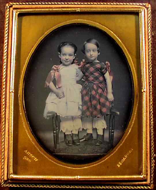 This is an hand colored, ½ plate daguerreotype (6 ¼” by 4 ¾”) of two smiling kids standing on a chair by ANSON, NYC. Very good condition. Signed in 2 places… On the fabric pad and on the brass mat, “ANSON, 589 BROADWAY N.Y.”. The children are not identified and we know nothing about the family. The children look to be about 2-4 years old.