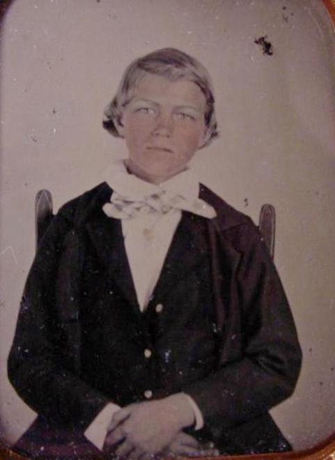 This early-1850s 1/9 plate size ruby red glass ambrotype is a portrait of an unidentified youth. The tinting is nicely done giving the impression of an actual color photograph. It shows what could be done with a ruby red ambro in capable hands. This portrait came with alot from North Carolina. It was a cased ambro. While not identified, some of the other material was related to the Jackson family. The boy wears a white shirt with a relativeky large collar and jacket. Note the informalway the bow is tied.