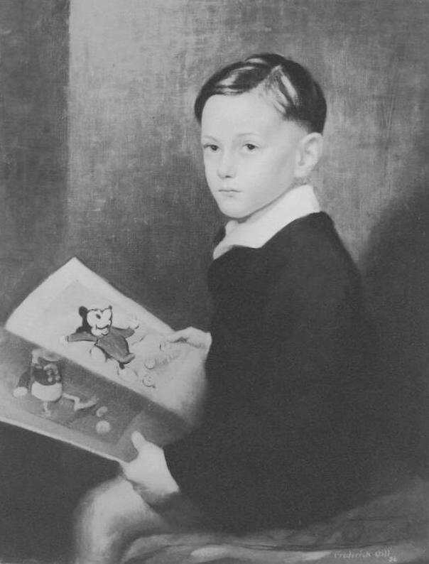 Here we hve a portrait from the E.R. Deats Studio, Philadelphia. It appears that an oil painting, perhaps based on a photograph. It shows a boy reading a Disney Mickey Mouse and Donald Duck book. This was a very early period in the history of the Mouse House. Mickey had just appeared a few years earlier. The oil is signed Frederick Gill 1936. I thought at first that this was the boy's name, but it must be the artist's name. The boy wears a dark short pnts suit with a sports collar.