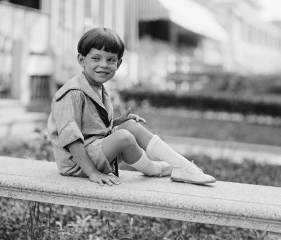 We have a photograph of a boy named George Dorsey. He is clearly an American boy, but we know nothing about his family or where he lived. All we know is that the photograph was taken in 1923. George looks to be about 4 years old. He wears what looks like a sailor suit without the traditional detiling. This was a wash suit, a play suit which could be easily washed. We're not sure about the color, perhaps grey. He also has white knee socks and white "t" strap sandals. We would guess that he was from a well-to-do family, not so much because of the sailor suit, but the white knee socks abd sandals suggest that he wears.