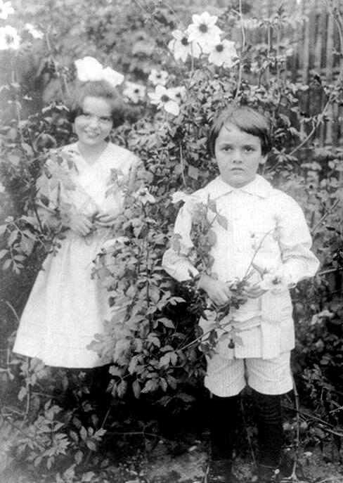 We note an interesting family photo of John Espey as a boy of almost 6 years of age and his sister, Mary Frances Espey. who was 8 years old. The snapshot was taken in the garden of a girls' school in the missionary compound of South Gate, a suburb of Shanghai, China, in 1918. John wears a white short-pants summer suit in 1918. John and Mary Frances were the children of Presbyterian missionaries in China. John and