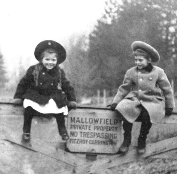 This photograph was taken during the winter of 1906. Mallowfield was their country estate located near Mamaroneck. N.Y. Both Harold and Phyllis are having fun with their father who has placed them on the gate to the estate with a no trespassing dsign. Both wear double breasted coats with stylish sailor caps. Notice Phyllis' long ringlets. Also notice that Harold's coat has a velvet collar rather than lapels. Both children wear black long stockings. The photograph here shows that they did not just use their country home in the summer. I wonder if father did not bring the children out to Mallowfield to select a Christmas tree. Notice that there is no sign of the house from the gate. Clearly there were sibstantial grounds around the home. We believe that there was also a beach front.