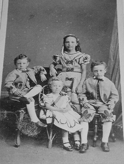 This CDV portrait is not a very good image, but we tend to use dated and named images, even wshn the image qulity is poor. CDVs continue to be widely used in England and the major European countries long after they declined in America. The portrait shows a family of the four Gibson children: George, Mary, Fred, and Ann. They look to be about 3-12 years old. The girls wear decoratd dresses. The boys wear identical cut-away jacket suits with vests and knickers long with white stockings. The suits are interesting because of the heavily emnbroidred decorations. This was an popular style in th 1860s and 70s. We note embroidered Fautleroy uits in the 1880s and 90s, but they wre almost always dark embroidery on dark suits and don't show up in the photographic record. Scarborough The Gibson Children 1871 Geo, Mary, Fred, and Ann. The studio was Inskip in Scarborough.