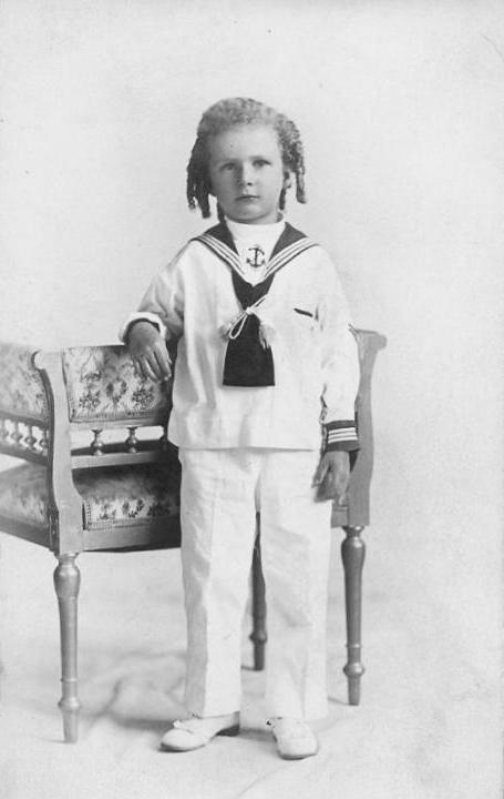 This photo postcard shows a boy named William Giles in an emaculate white sailor suit. It is a long pants sailor suit done with traditional styling. The sailor scarfe is a little different than what we usually see and worn with a white wstring tie. This was more common in Germany than America. There is an anchor dickey. William's hair is done in short ringlets, a style becoming less common at the time. The AZO post stamp box dates the postcard to 1904-18. The back indicate that William was 4 years old. The studio was Bussa in Norristown, Pennsylvania.