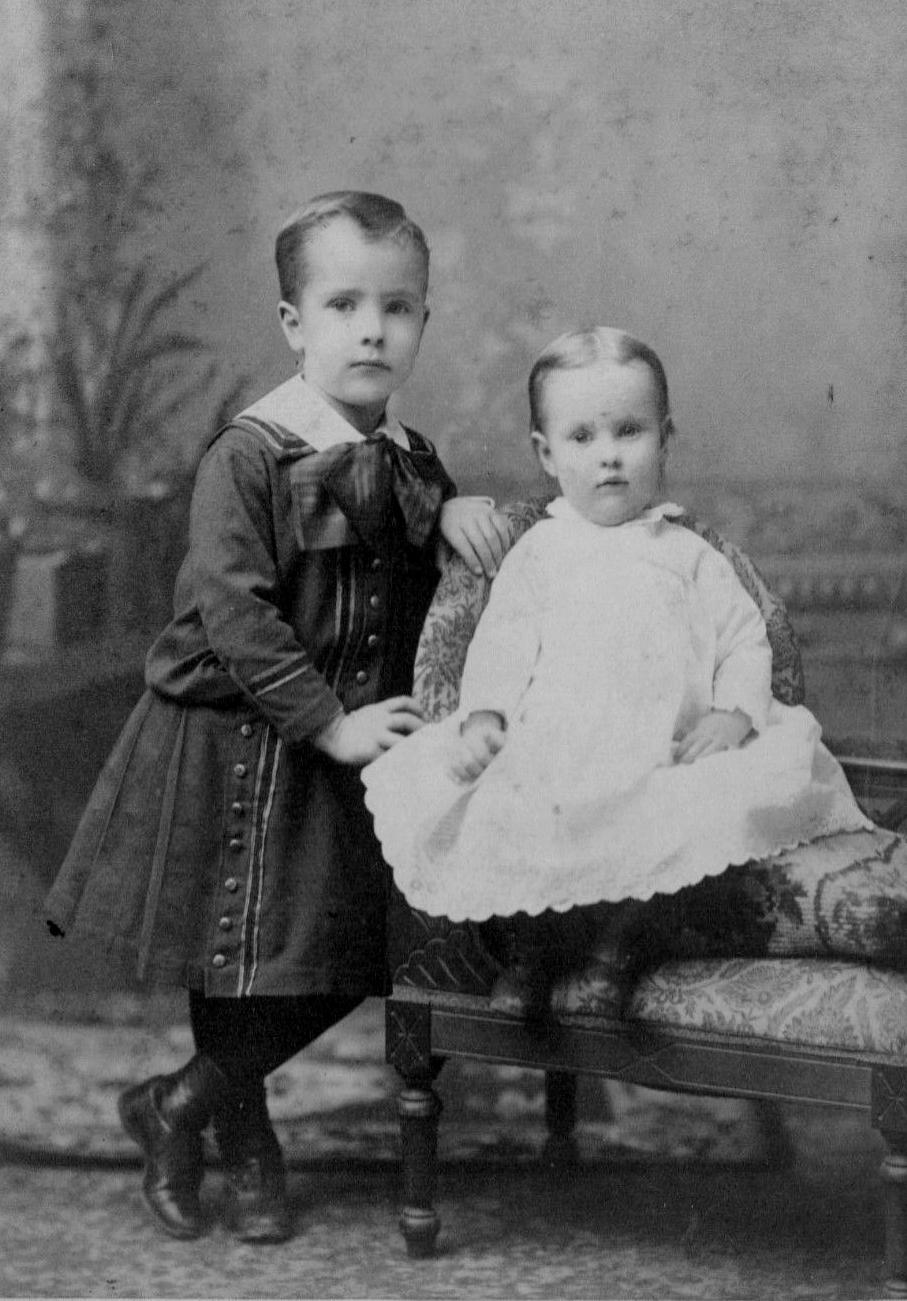 This cabinet card portrait shows James and Helen Gilman. They look to be about 1-4 years old. It is well poised as one might expect with a ain Street studio. James is leaning toward his baby sister. We are not sure how to date the portrait, but would guess about 1890. Helen wears a white baby dress. James wears a kilt suit with an Eton collar anf floppy bow. The kilt suit top was a blouse with sailor styling. It has stripe and buttom trim, but not a 'V' front. The blouse stripes and buttons are continued on to the kilt suit. He has black long stockings and high-top shoes. The studio was C. Isaacs on Main Steet in Madison, Wisconsin.
