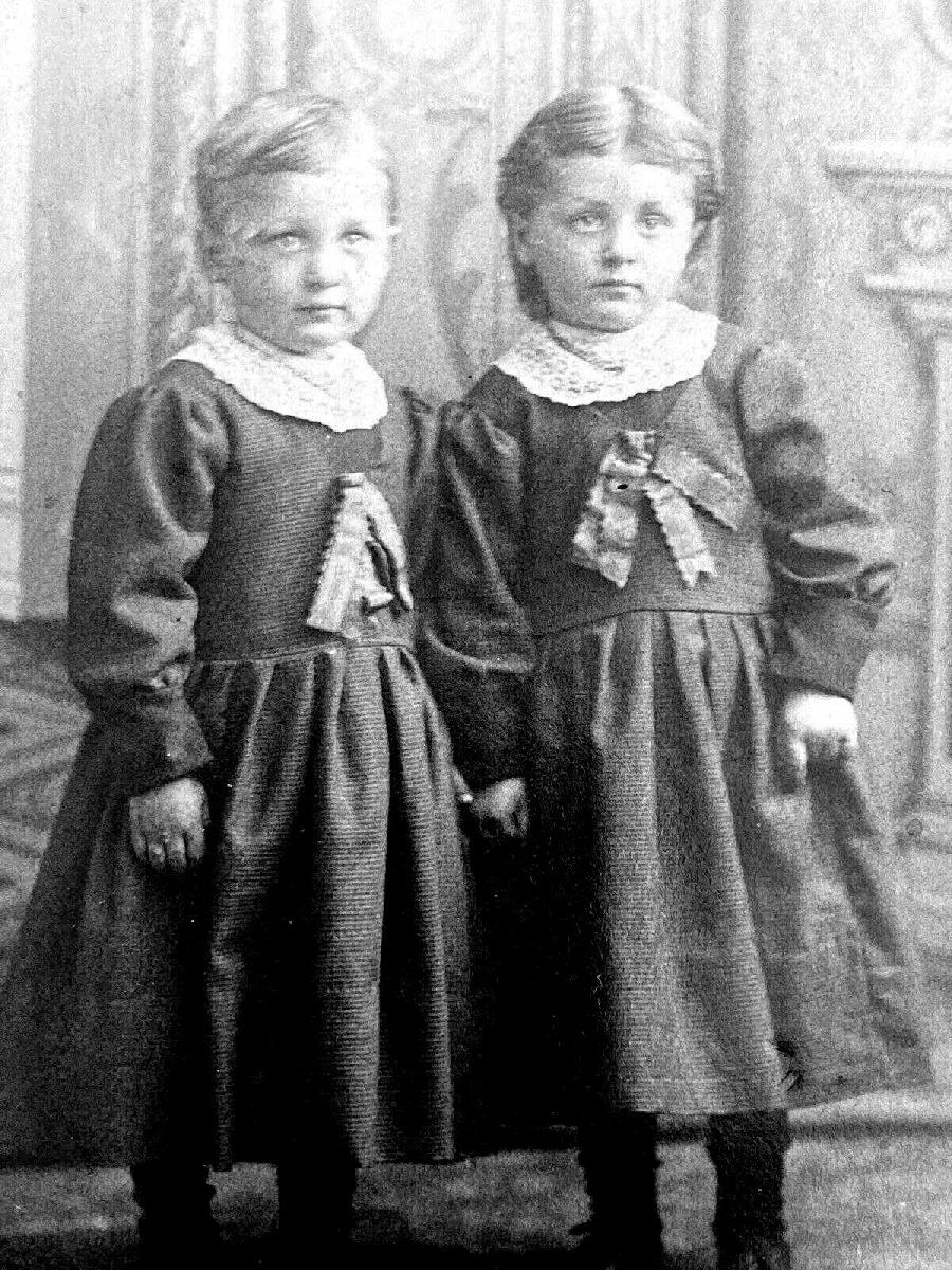 One example of siblings wearing matching dresses is a cabinet card studio portatit of Nathaniel and Bertha Gilpatricn in 1892. Gilpatrick would have been more common, but the incription on the card is definitely Gilpatricn. They were from Richmond, Maine and look to be about 3 years old. The children are the same height, but Bertha looks a little older. The dresses are identical, very plain long-sleeved with a decormnative bow on the nodice. Even the fancy white collars are identical. We are unsure about the color of the dresses. The dresses are very long, but they seem to be wearing black long stockings. The long length probably was a to make the dresses so the children could wer them for at least a couple years. The studio was Anserson in Richmond.