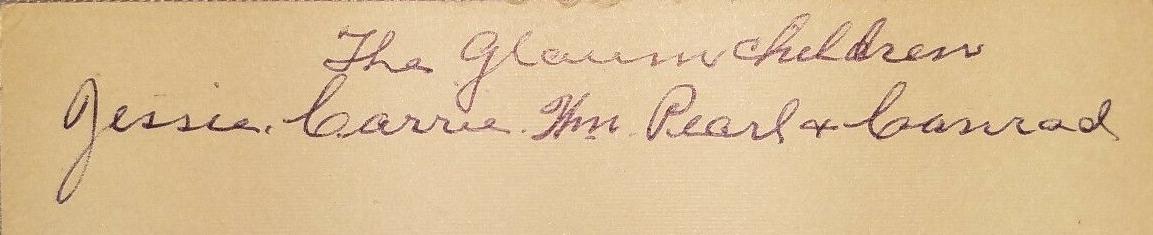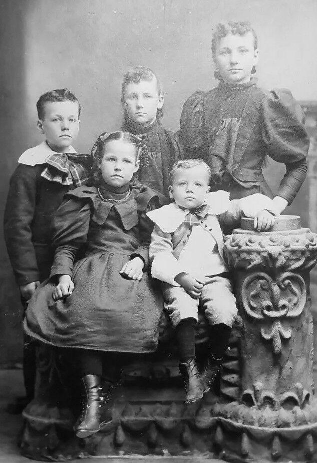 Here we have the family name, although it is difficult to make out. As best we can tell is something like Gleguim. We see Jessie, Carrie, Wm, Pearl, and Conrad. Therevare two boys and three girksm about 2-15 years old. The girls erat stylish dark dresses. Notice the large balppn sleeves. The boys wear suits with Fauntleroy touches. The older boy wears a dark, collar-buttoming suit. The youngedr boys wears a classic cut-away jacket. The younger boy a few years earlier would not yet have been breeched. The porttait is not dated, but the mount style and clothing styles, especially the girls' dresses place it in the 1890s. The mount is a light color with impressed silver printing. The studio name is a little difficult to read, something like R.D. Ryerson in Detroit, Minnesota.