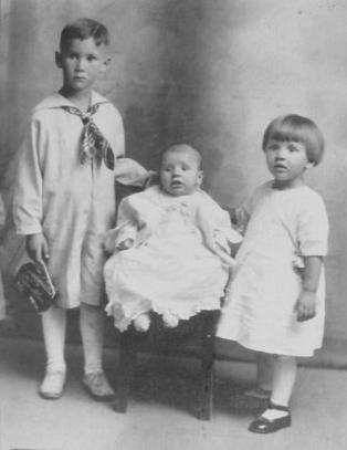 This studio portraait shows Robert Greely and his two younger siblings. the portrait is undated, but the grey paper frame looks like the 1910s to us. There are three children in the portit which helps us estimate the children's age. It is rare for children to be separated less than a year and a half. The baby looks to be less tan a year old whivh wuold mean that the middle child wearing a plain white dress, white long stockings, and bkack strap shoes is about 3 years old. We are not sure about gender, but suspect the child is a girl. Robert looks to be a good bit older than the middle child. We would guess about 6-7 years old. We are not sure at all as to what he is wearing. It does not look like a button-on two pice sailor outfit, although the image is not very detailed. It looks like he is wearing a sailor dress. But the way the hem hangs, we suapect is may be a one-piece knee pants sailor outfit. This would be, however, rare withour a waist band or belt of some kind. Sonyour guess here is as good as ours. It is rare for an older boys of school age to still be wearing a dress in the 1910s, but not unknon. He is also wearing white long stockings. We also do not know what Robert is holding.