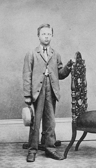 This is CDV portrait shows a a boy holding a hat. Notice that it is slightly conical with a nearly flat-top hat. We do not know just what to call this hat. It seems somewhere between a boater and a rounded-crown hat. It seems to be a hat an adult could wear. We can't make out his neckwear. He has a suit with a long-cut jacket and long pants. Iy has a checked pattern. Notice how he uses only one of the buttons to close his jacket. This seems influenced by the cut-away jacket he probably wore as a younger boy. He does not seem to have a belt or if he does it is very narrow. The boy is identified on the back as, Clifton Harrison, age 12. The portrait was was taken by Tousley in Keesville, New York. There is an orange 2 cent bankcheck tax stamp on the back ink cancelled with the date July 26, 1866. There were no special stamps for photographs so whatever revenue stamps available were used. The portrait is a classic American 1860s CDV portrait. Not how different it is from Dags and Ambros where the suject was usually seated and the background dark. And the spatial impression is that of an almost empty room.