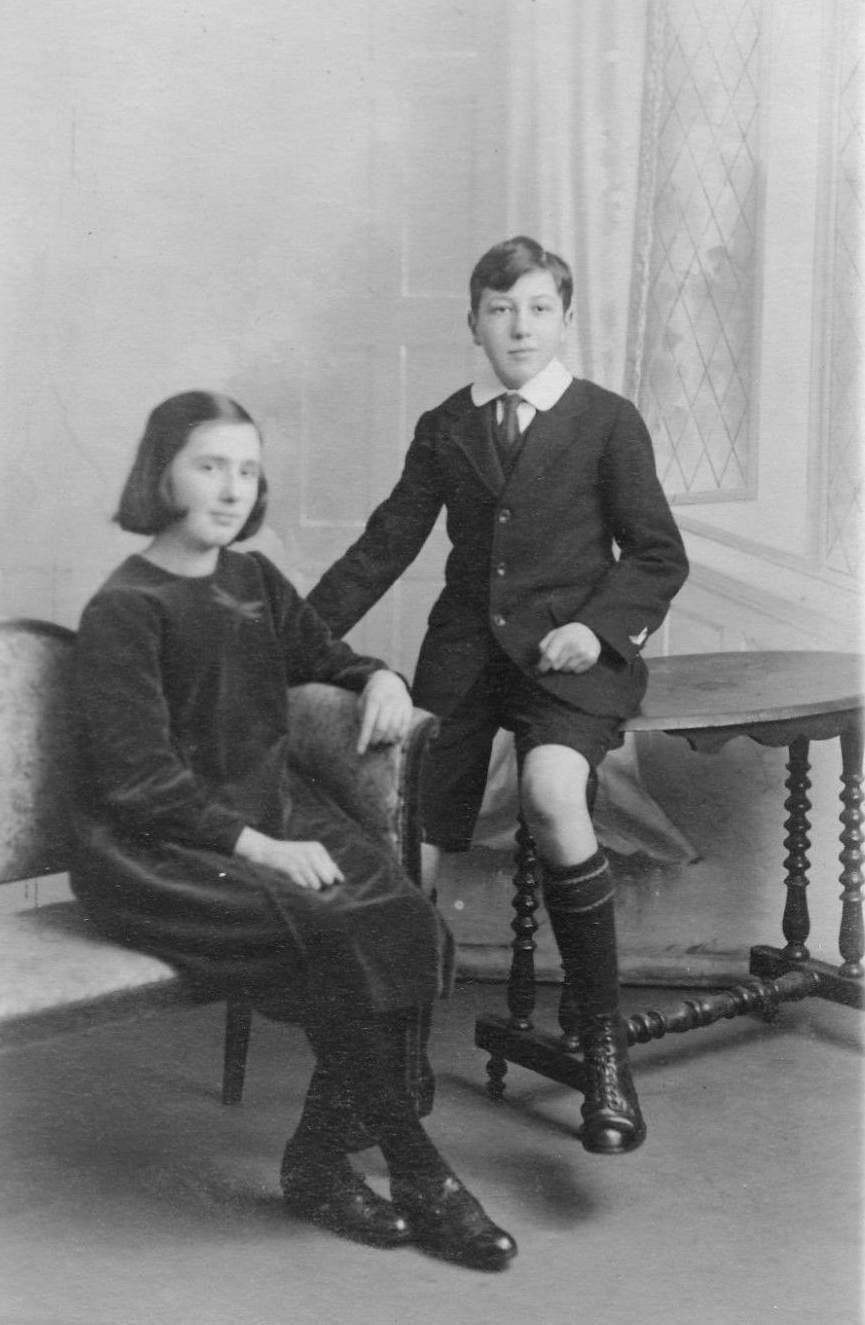 Here we have a formal studio portrait of a brother and sister, Charles and Anne Hatch. They look o be about 13-16 years of age. It is a post-card back portrait. The card stock is the KLtd brand which appeared 1918-36, but the clothes suggest to us that it was taken during the mid pahase of that range, probably about 1925. The high-cut shoes here are a factor. We would say that they came from a well-to do family. They could be wearing school clothes, perhaps just such garmnts. Charles wears a sungle breasted vested wuit with short pants. The Eton collar was going out of style for boys, but still worn at some schools. Note the boys's Eton here does not have pointed tips. He is wearing school socks. The girl wears a plain dark dress with long stockings. They were not longer very common by 1930, but still worn some conservative schools. The studio was Seaman in Southport.