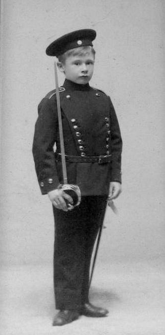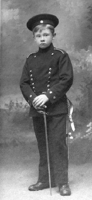 John wears a military uniform with what looks like a sailor cap. The uniform is not one I have seen American boys wearing. I has rather the look of a German cadet to it. Our guess is that John's father personally selected this uniform for his son. For one reason, an 8-year old American boy would not have asked for a German uniform. We think American boys dressing up in German uniforms was not very common. This are several reasons for this. Many of the Germans who immigrated to America were famers and merchants who often had anti-military attitudes and objected to conscription. Many Germans came to America after the failed revolutions of 1848 which were put down by military force. German Americans who were second and third generation would not have likely chosen a German uniform. They would have chosen an American looking uniform. Three are epaulettes with piping and two rows of buttons. Hauerwaas does seem to be a German name. The cap looks to have a German emblem on it although the image is not clear enough to tell for sure. A few years after the portrait was taken, America went to war with Germany. Actually there were attacks on Germans and German shops were ransaked. German shepards were renamed Alsatians. John never would have worn this uniform during or after the War. We suspect that his father still had strong attachments to Germany. John assumes various military poses for the different portraits. A sword has been added for add to the martial image. Notice how it is perfectly scaled down for John. Of course an 8-tear old boy could do a lot of damage with a sword like that. My guess is that it was put away for safe keeping at home.
