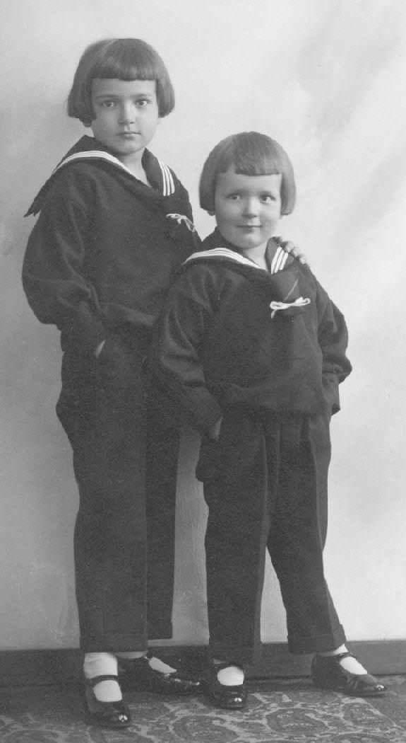 The Fourth picture is dated 15th July 1926.  The boys look to be about 4 and 8 years old.  They wear identical dark sailor suits and this time are both sporting long pants.  I am not sure if this was done for for fashionable reasons or to provide the boys warm winter clothing.  They look like heavy wool suits, but the portrait was taken in July.  Perhaps mutter was preparing for the winter season.  The long pants were cuffed which was not common in sailor suirs.  The suits have very traditional three stripe detailing.  Their sailor sacrves are neatly tied as was the style in many German images that we have noted.  The boys wear patent leather strap shoes, this time without the bows, and white socks with their sailor suits.  They also have their hair cut in identical bangs.