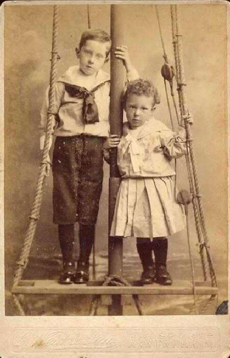 Here we see a studio portrait of Philip and Maurice House. They look to be aboput 4-7 years old. The boys wear sailor outfits and are photographed in mock sailor rigging. The younger boys wears a sailor dress. We are guessing that the portrait was taken in the 1880s, but we are not sure about that. The sailor outfits are not yet standardized with the stripe detailing. Both children wear black long stockings and strap shoes. We also think the children are English. These rigging portraits are more commonnin England than America. The card logo seems to say G. West & Son. The studio was apparently located in Gosport and Fareham. I am sure that this is the Gosport in England. (American cabinent cards usually indicate the state.) The main studio would have been in Gosport with a branch in Fareham, which is another small market town a few miles away. Apparently Fareham was also a flourishing seaport, in the Middle Ages, but it could only handle small ships and as these generally got larger, the trade moved away, probably to nearby Southampton where modern liners sail from. Gosport in England lies adjacent to Portsmouth and together they form the main Royal Navy base on the south coast.
