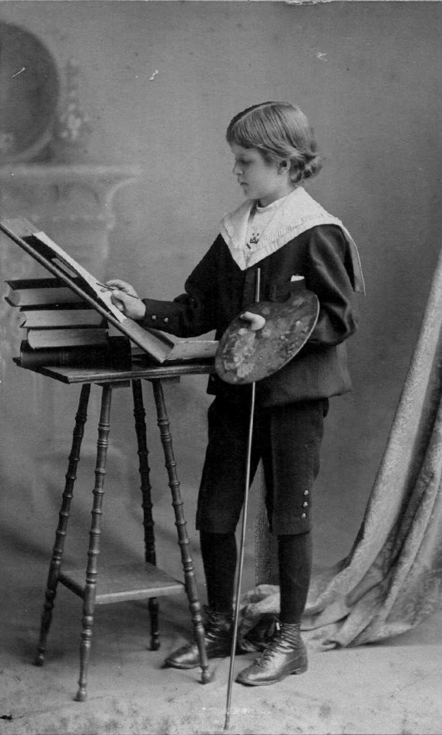 The studio cabinet card studio portrait here shows Waldo Hunt Hurst holding a palette and painting a picture. This not a studio prop we ordinarily see so perhaps Waldo had artisttic talents and he brought his art materials with him to the studioso he could pose with them. We are not sure about this. While waldo is idenifed on the back, the portrait is no dated. We would guess it was taken at the turn-of-the 20th century, either the late-1890s or the early-1900s. Waldo looks to be about 10-11 years old. He wears a dark knee pants sailor suit with a 'V' white collar and back flap. The white dickie has an embroidered crest, but we can not make it out. The suit is prrobably dark blue. He wears the standard black long stockings and high-top shoes. His hair is carefuly parted near, but not at the center. He has longish hair, but not shoulder-length ringlets.