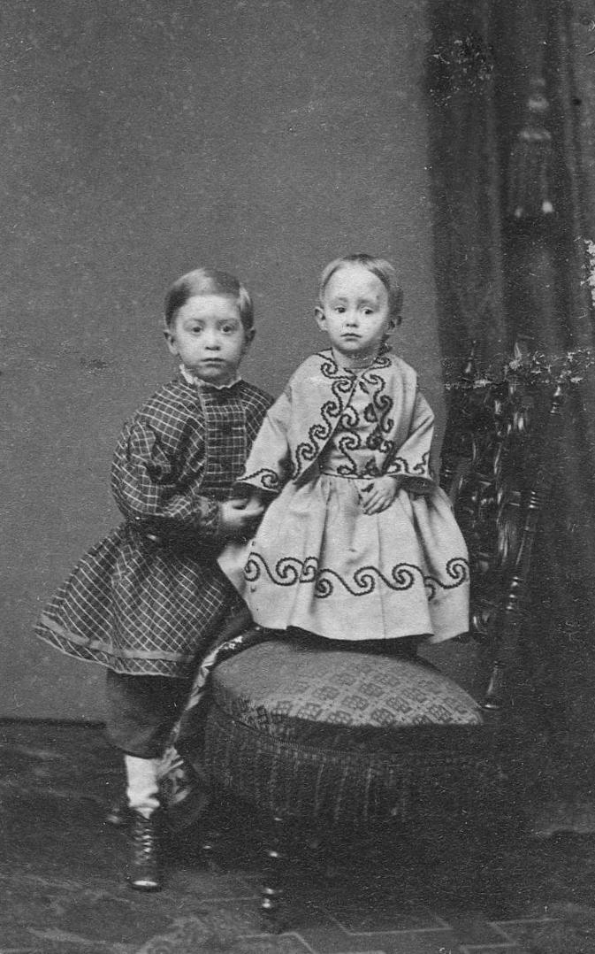 This CDV portait  dates to the 1860s, probably after the Civil War (1861-65). The two children are identified as Henry and Annie Jarvis. The children look to be about 2-5 years old.  Henry wears a kind of check or tatarsall tunic with a small ruffle at the neck.  Tunics seem more popular in the 1850s, but we see a number in the 1860s as well.  The patterned tunics also seem more common in the 50s. His tunic is tighly belted at the waist, although we can not see the belt. The tunic is fuller and longer than many we have seen in the 1860s. We are guessing that mother expectyed him to wear it for a few years. He has contrasting solid colored pants that look like knickers. He also has white stockings and high-top shoes. Annie wears a jacketed dress with elaborate embroidery. Henry might have worn it earlier. The studio was Powelson in Rochester and Buffalo, New York.